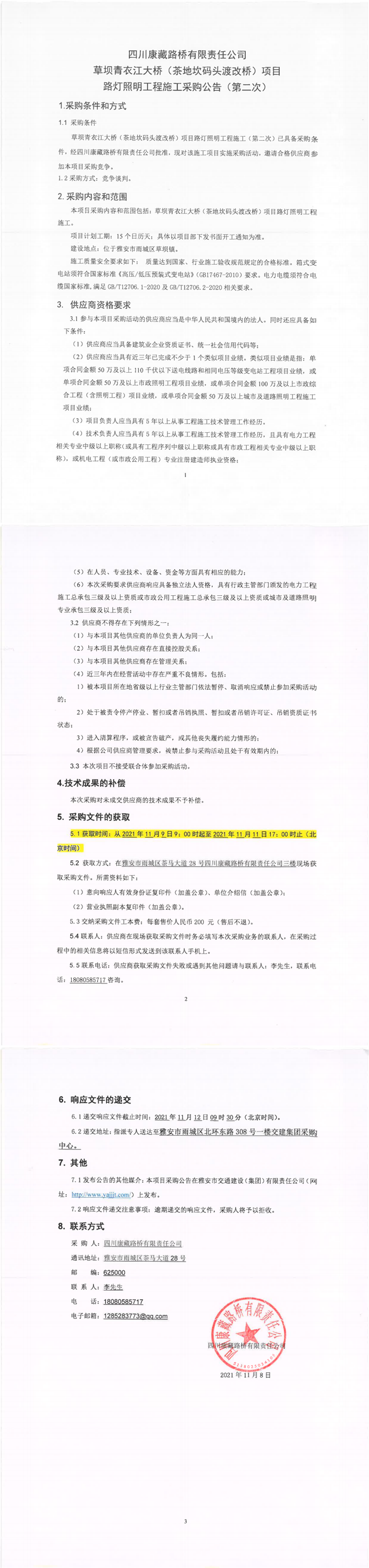 四川康藏路橋有限責(zé)任公司草壩青衣江大橋(茶地坎碼頭渡改橋)項(xiàng)目路燈照明工程施工采購(gòu)公告(第二次)