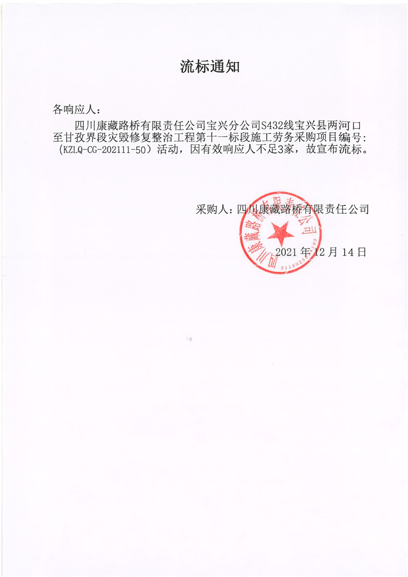 S432線寶興縣兩河口至甘孜界段災(zāi)毀修復(fù)整治工程第十一標(biāo)段施工勞務(wù)(第二次)流標(biāo)通知