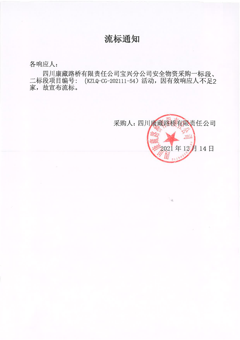 四川康藏路橋有限責(zé)任公司寶興分公司安全物資采購(gòu)一標(biāo)段、二標(biāo)段項(xiàng)目流標(biāo)通知