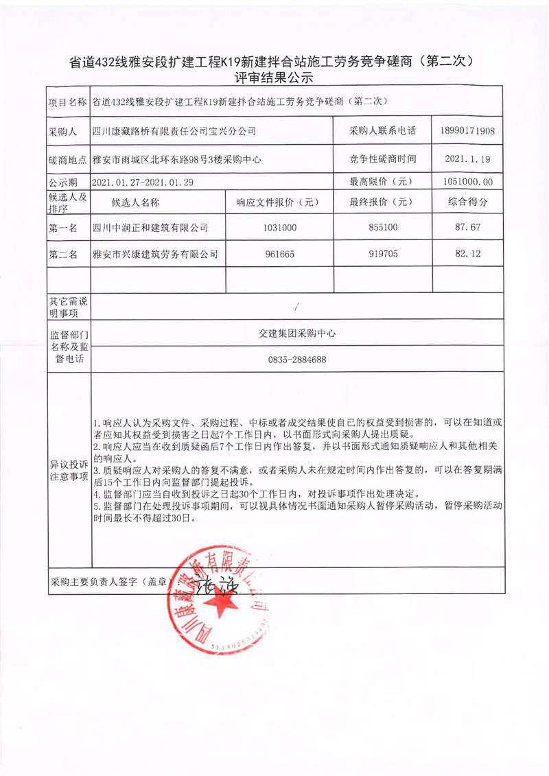 四川康藏路橋有限責(zé)任公司寶興分公司省道432線雅安段擴(kuò)建工程K19新建拌合站施工勞務(wù)競(jìng)爭磋商(第二次)評(píng)審結(jié)果公示
