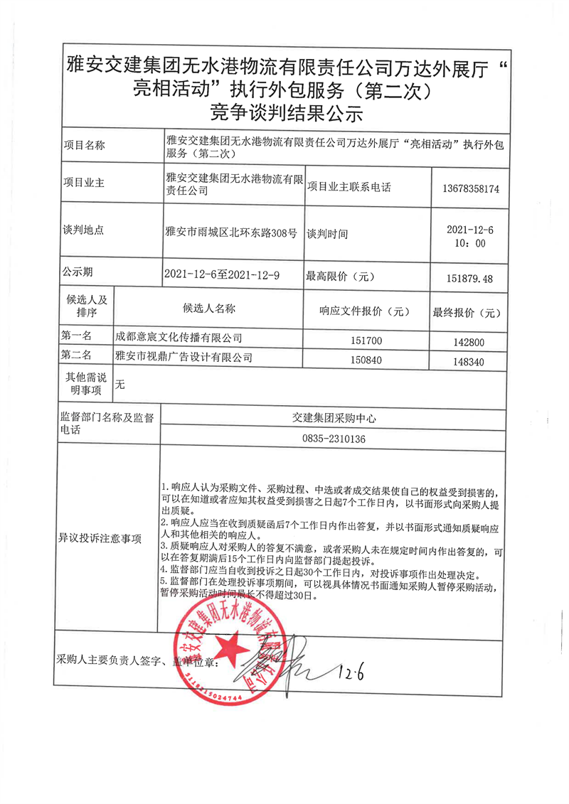 雅安交建集團(tuán)無(wú)水港物流有限責(zé)任公司萬(wàn)達(dá)外展廳“亮相活動(dòng)”執(zhí)行外包服務(wù)(第二次)競(jìng)爭(zhēng)談判結(jié)果公示
