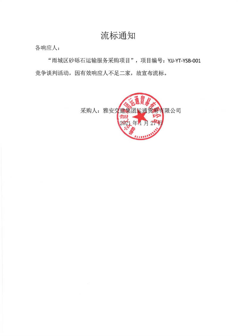 雅安交建集團運通貿易有限公司雨城區(qū)砂礫石運輸服務采購項目流標通知
