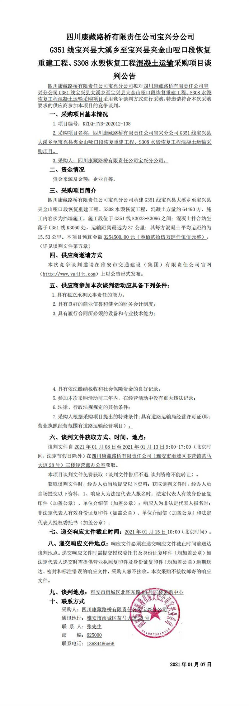 四川康藏路橋有限責任公司寶興分公司G351線寶興縣大溪鄉(xiāng)至寶興縣夾金山啞口段恢復重建工程、S308水毀恢復工程混凝土運輸采購項目談判公告