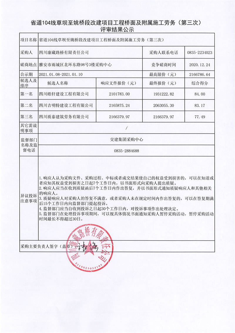 四川康藏路橋有限責(zé)任公司省道104線草壩至姚橋段改建項(xiàng)目工程橋面及附屬施工勞務(wù)(第三次)評審結(jié)果公示