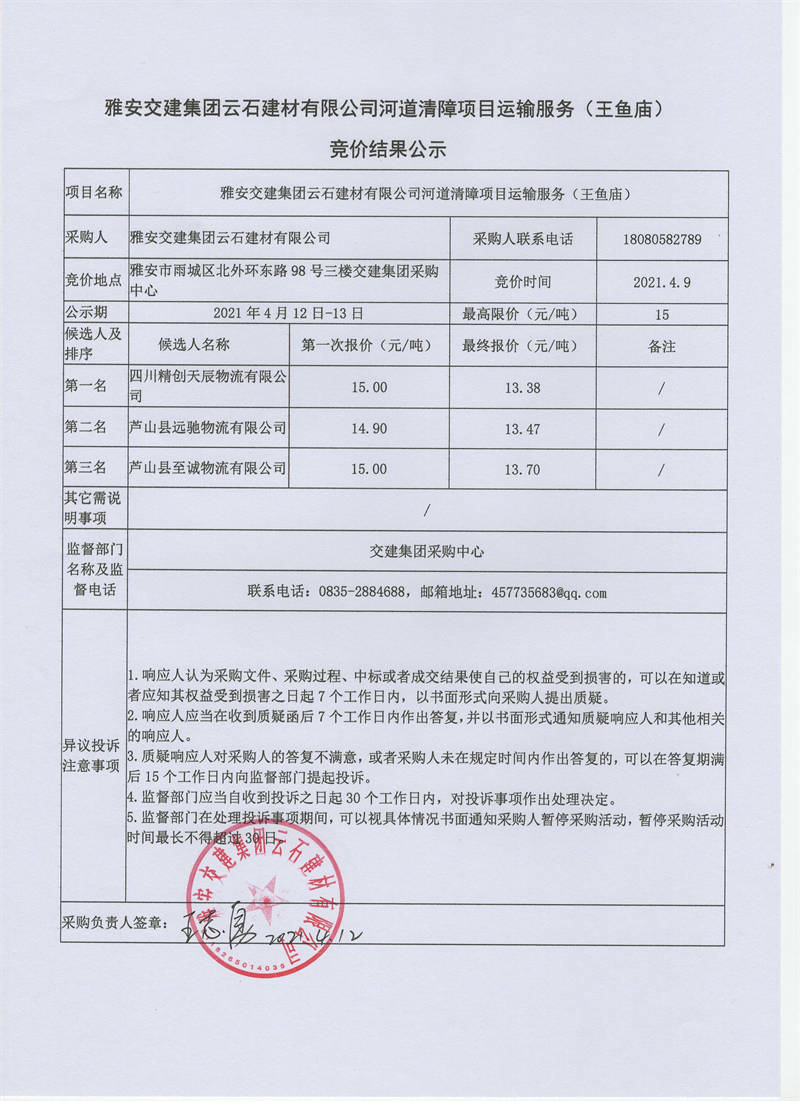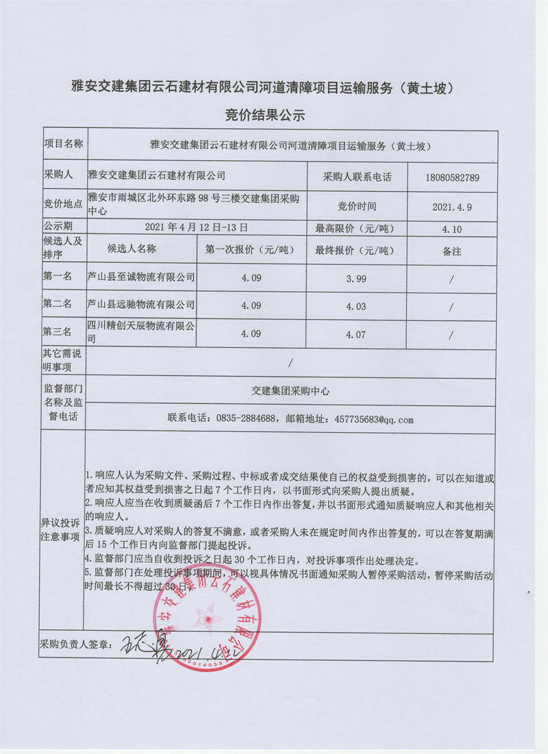 雅安交建集團(tuán)云石建材有限公司河道清障項目運輸服務(wù)競價結(jié)果公示