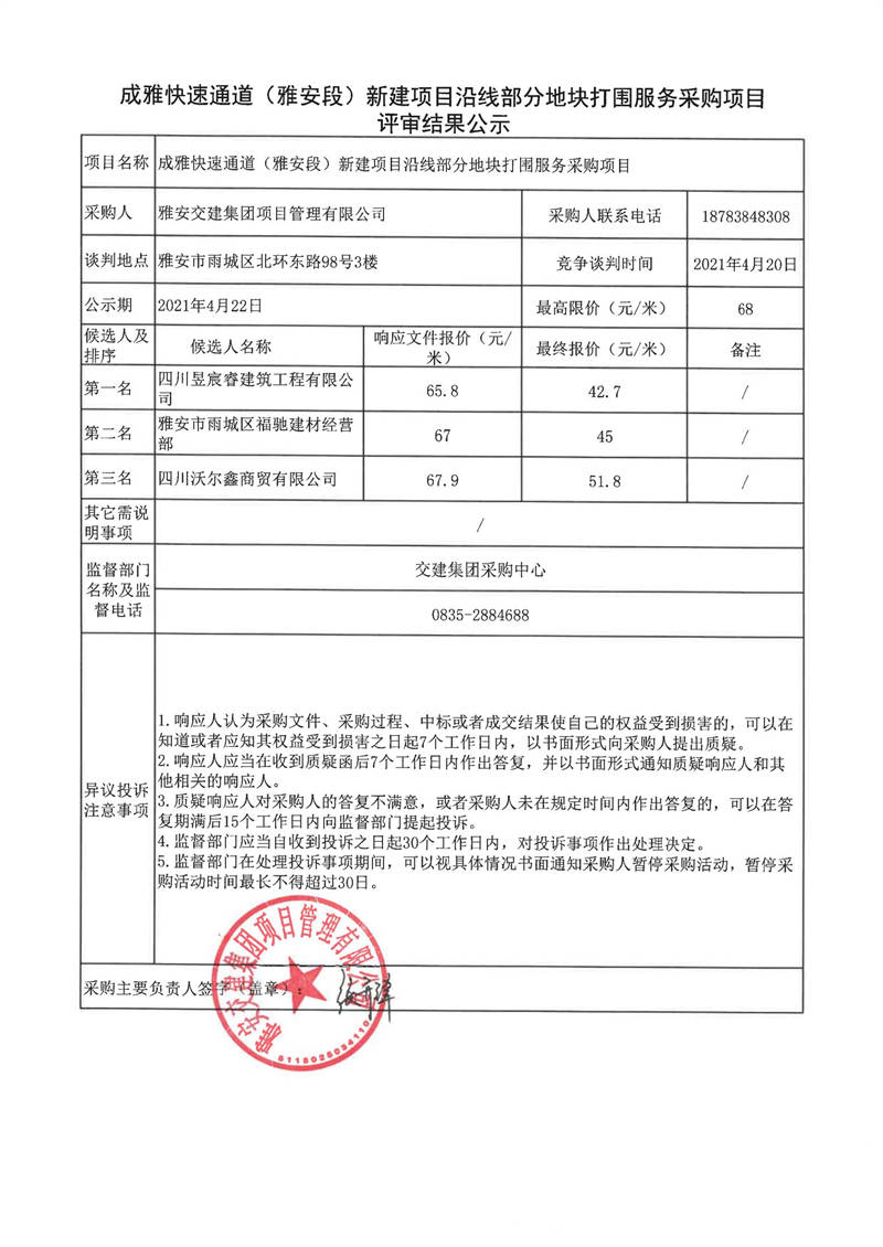 雅安交建集團項目管理有限公司成雅快速通道(雅安段)新建項目沿線部分地塊打圍服務采購項目評審結果公示