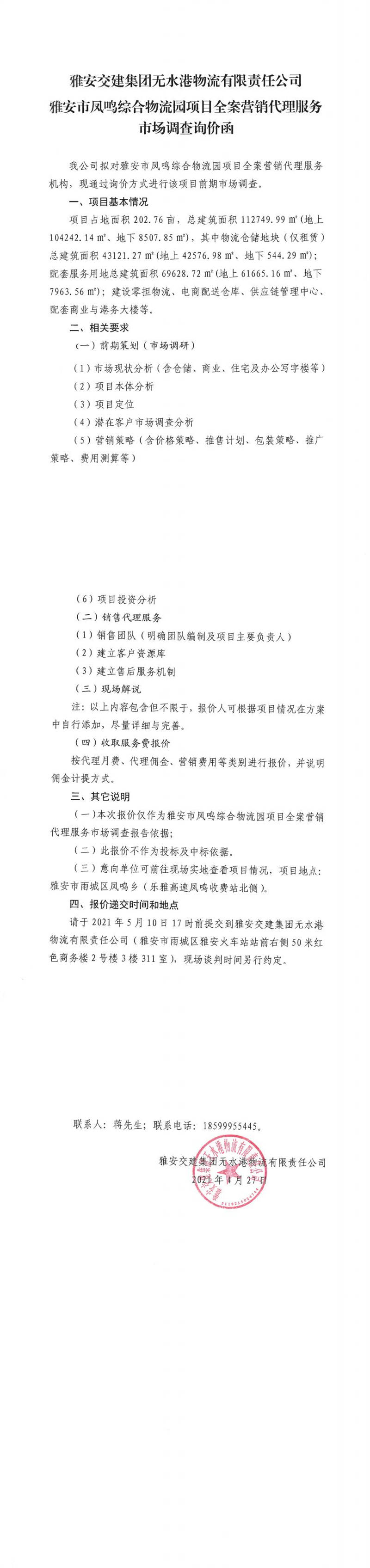 雅安交建集團(tuán)無水港物流有限責(zé)任公司雅安市鳳鳴綜合物流園項目全案營銷代理服務(wù)市場調(diào)查詢價函