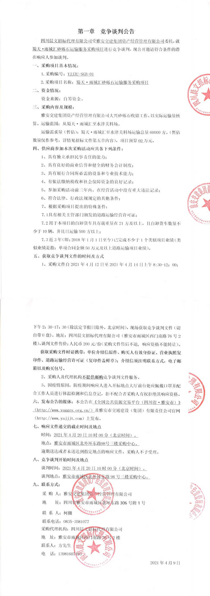 雅安交建集團(tuán)資產(chǎn)經(jīng)營管理有限公司蜀天.雨城匯砂礫石運輸服務(wù)采購項目競爭談判公告