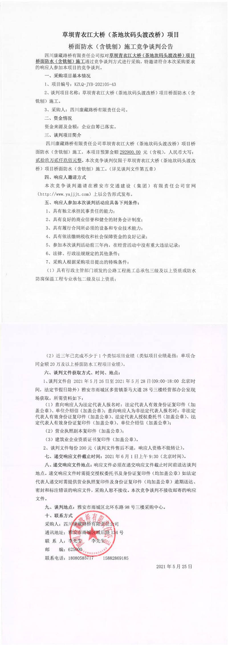 四川康藏路橋有限責(zé)任公司草壩青衣江大橋(茶地坎碼頭渡改橋)項(xiàng)目橋面防水(含銑刨)施工競爭談判公告