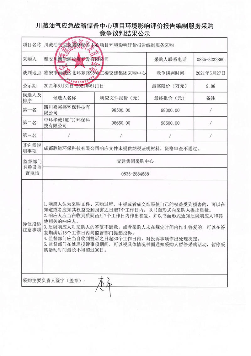 雅安川西能源投資開發(fā)有限公司川藏油氣應(yīng)急戰(zhàn)略儲(chǔ)備中心項(xiàng)目環(huán)境影響評價(jià)報(bào)告編制服務(wù)采購競爭性談判結(jié)果公示