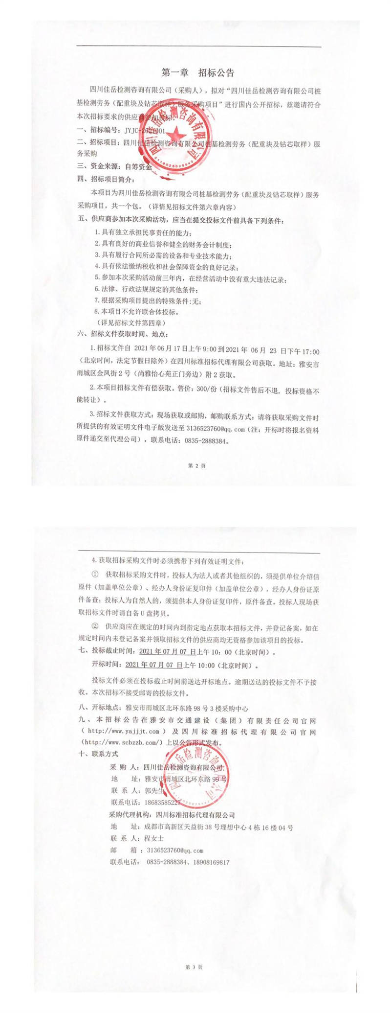 四川佳岳檢測咨詢有限公司樁基檢測勞務(wù)(配重塊及鉆芯取樣)服務(wù)采購招標(biāo)公告