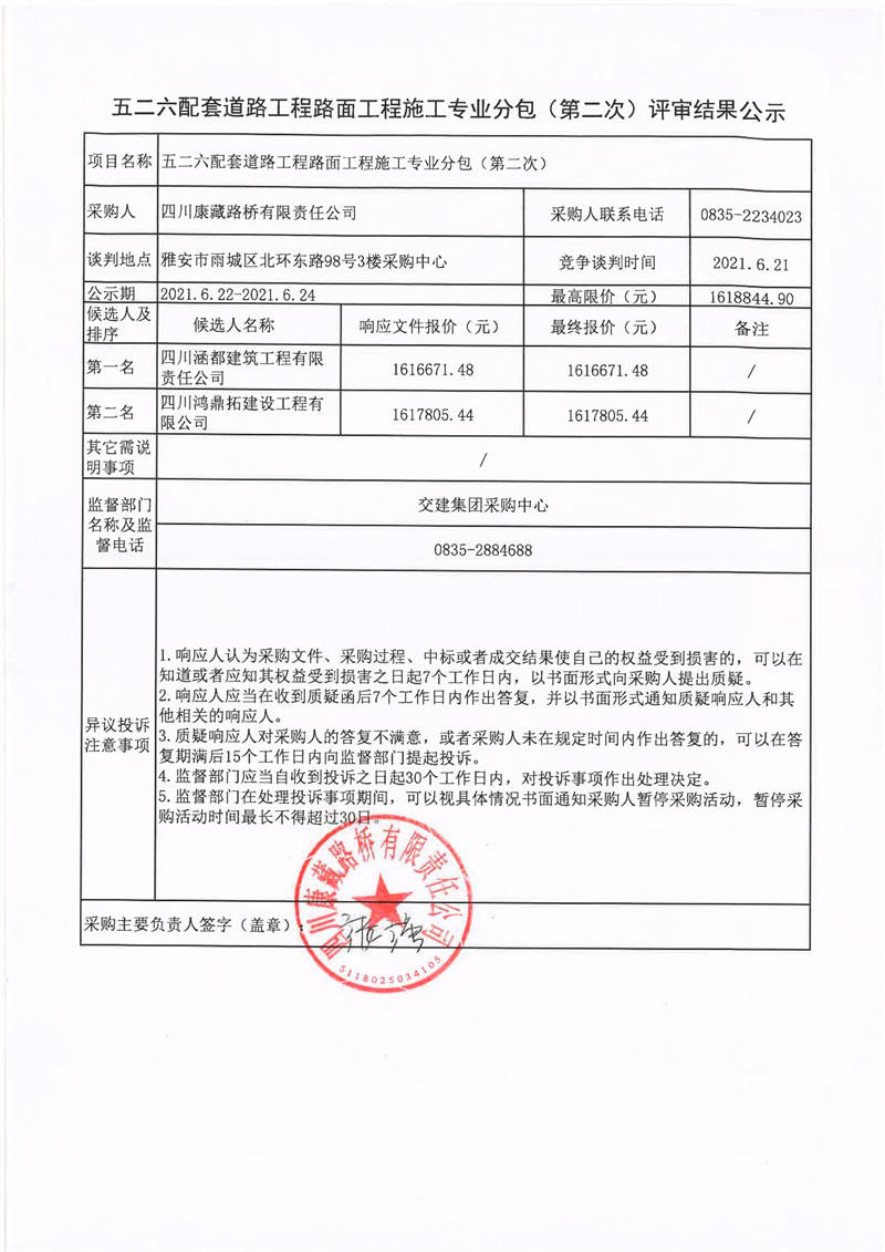 四川康藏路橋有限責(zé)任公司五二六配套道路工程路面工程施工專(zhuān)業(yè)分包(第二次)評(píng)審結(jié)果公示