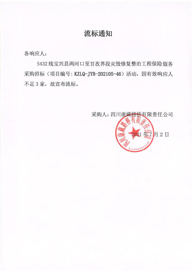 四川康藏路橋有限責(zé)任公司S432線寶興縣兩河口至甘孜界段災(zāi)毀修復(fù)整治工程保險(xiǎn)服務(wù)采購流標(biāo)通知