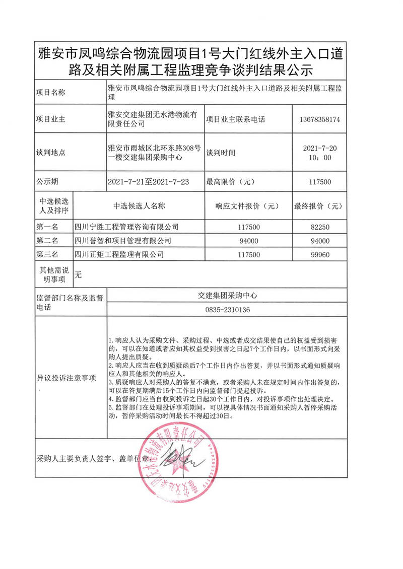 雅安交建集團(tuán)無水港物流有限責(zé)任公司雅安市鳳鳴綜合物流園項(xiàng)目1號(hào)大門紅線外主入口道路及相關(guān)附屬工程監(jiān)理競(jìng)爭(zhēng)談判結(jié)果公示