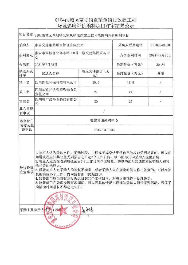 雅安交建集團(tuán)項目管理有限公司S104雨城區(qū)草壩鎮(zhèn)至望魚鎮(zhèn)段改建工程水土保持方案編制服務(wù)項目評審結(jié)果公示