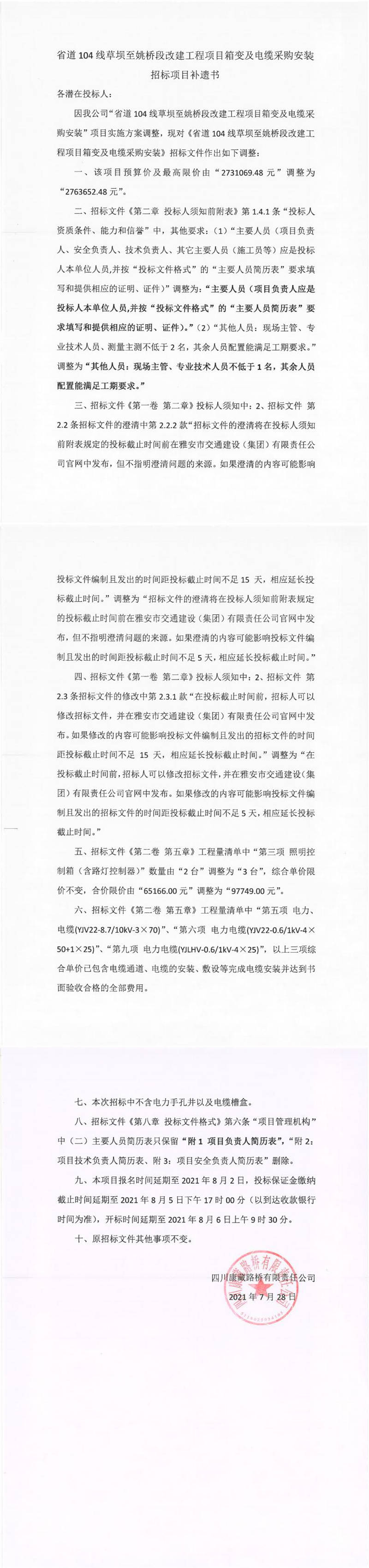 四川康藏路橋有限責(zé)任公司省道104線草壩至姚橋段改建項(xiàng)目箱變及電纜采購(gòu)安裝招標(biāo)項(xiàng)目補(bǔ)遺書(shū)