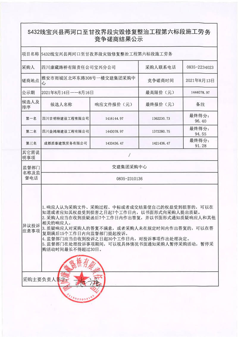 四川康藏路橋有限責(zé)任公司寶興分公司S432線寶興縣兩河口至甘孜界段災(zāi)毀修復(fù)整治工程第六標(biāo)段施工勞務(wù)競(jìng)爭(zhēng)磋商結(jié)果公示