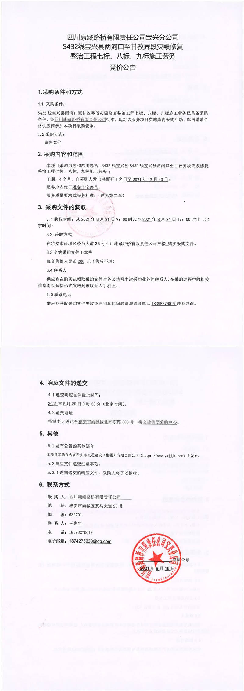 四川康藏路橋有限責(zé)任公司寶興分公司S432線寶興縣兩河口至甘孜界段災(zāi)毀修復(fù)整治工程七標(biāo)、八標(biāo)、九標(biāo)施工勞務(wù)競價公告