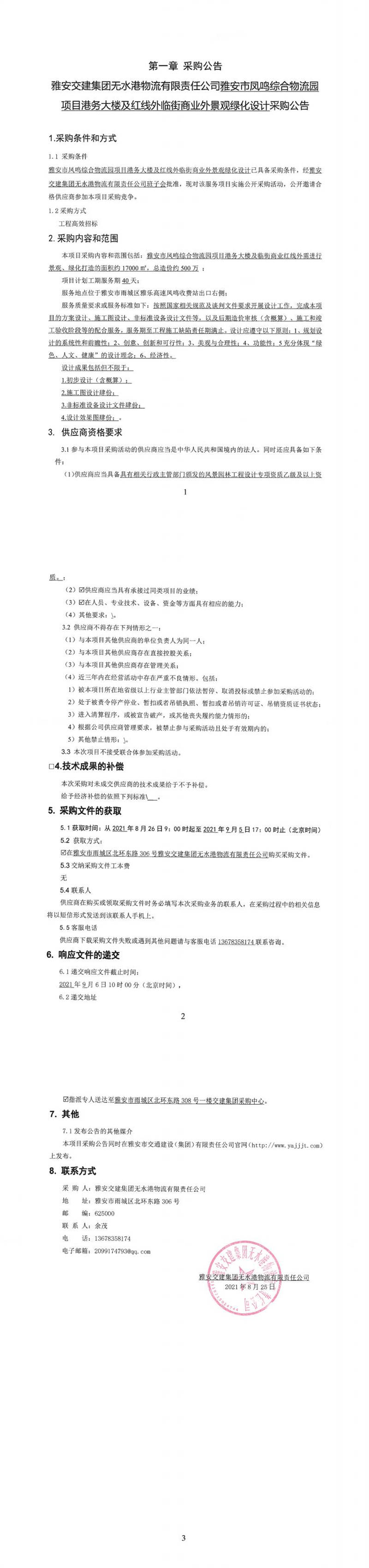 雅安交建集團(tuán)無(wú)水港物流有限責(zé)任公司雅安市鳳鳴綜合物流園項(xiàng)目港務(wù)大樓及紅線外臨街商業(yè)外景觀綠化設(shè)計(jì)采購(gòu)公告