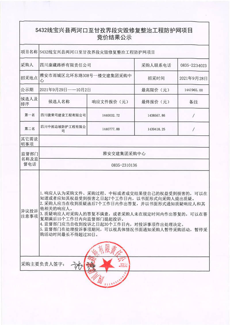 四川康藏路橋有限責(zé)任公司S432線寶興縣兩河口至甘孜界段災(zāi)毀修復(fù)整治工程防護(hù)網(wǎng)項(xiàng)目競價(jià)結(jié)果公示