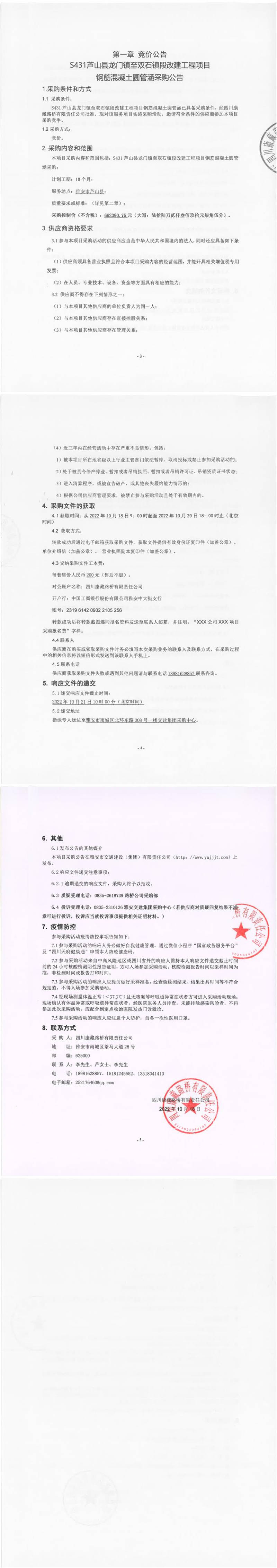 四川康藏路橋有限責(zé)任公司S431蘆山縣龍門(mén)鎮(zhèn)至雙石鎮(zhèn)段改建工程項(xiàng)目鋼筋混凝土圓管涵采購(gòu)公告