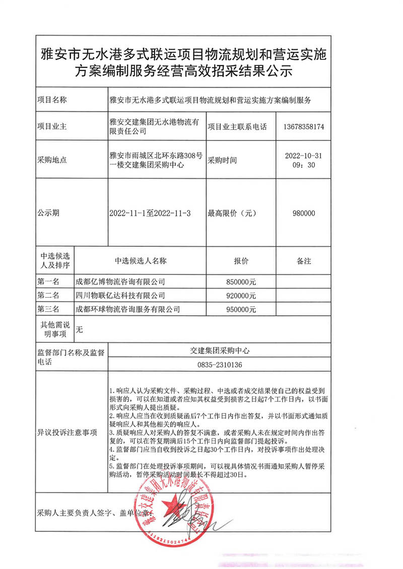 雅安交建集團無水港物流有限責任公司雅安市無水港多式聯(lián)運項目物流規(guī)劃和營運實施方案編制服務(wù)經(jīng)營高效招采結(jié)果公示
