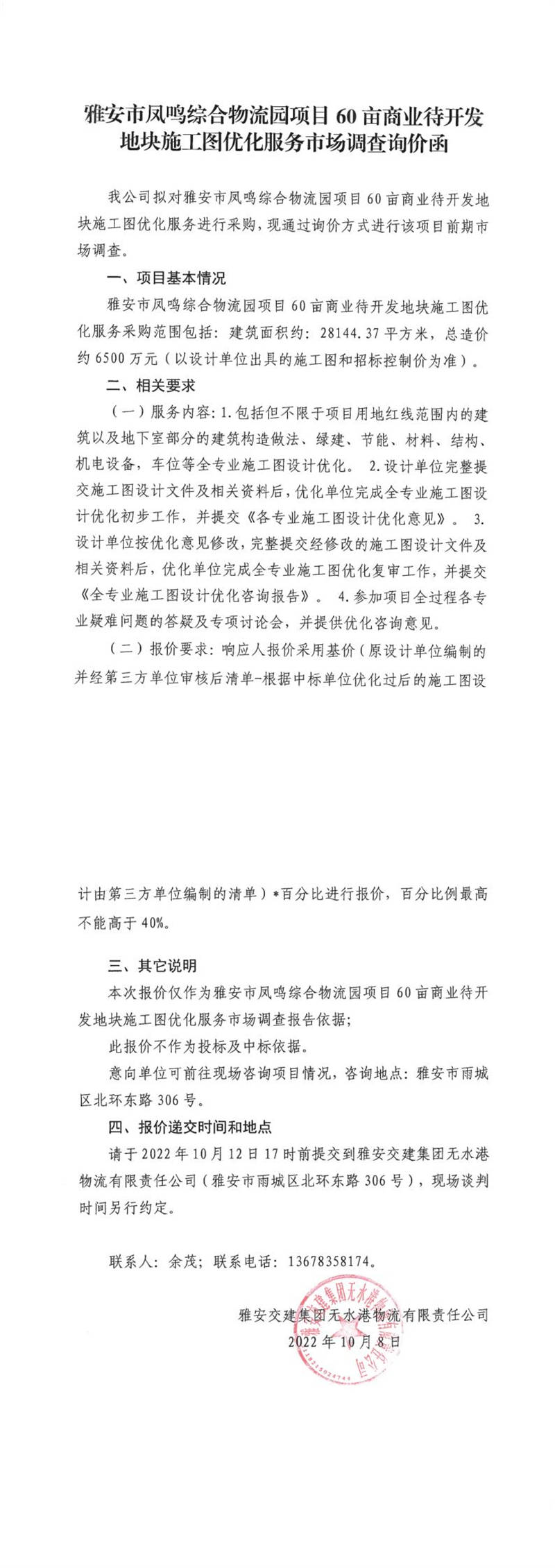雅安交建集團無水港物流有限責任公司雅安市鳳鳴綜合物流園項目60畝商業(yè)待開發(fā)地塊施工圖優(yōu)化服務市場調(diào)查詢價函
