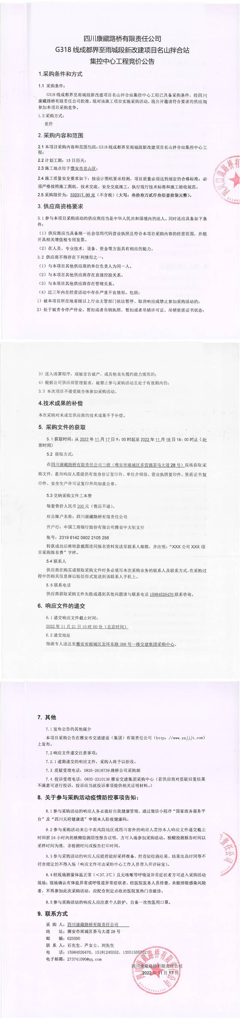 四川康藏路橋有限責(zé)任公司G318線成都界至雨城段新改建項(xiàng)目名山拌合站集控中心工程競(jìng)價(jià)公告