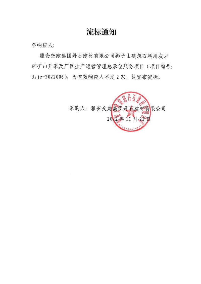 雅安交建集團丹石建材有限公司獅子山建筑石料用灰?guī)r礦礦山開采及廠區(qū)生產(chǎn)運營管理總承包服務項目采購流標通知