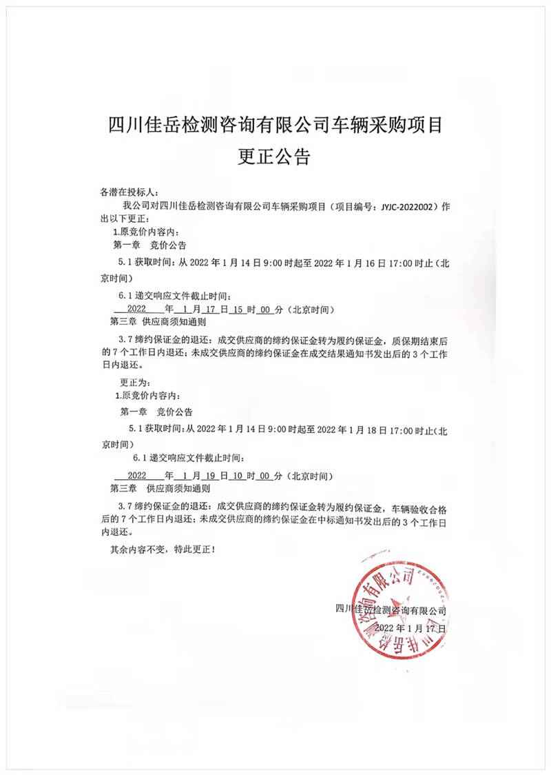四川佳岳檢測咨詢有限公司車輛采購項目更正公告