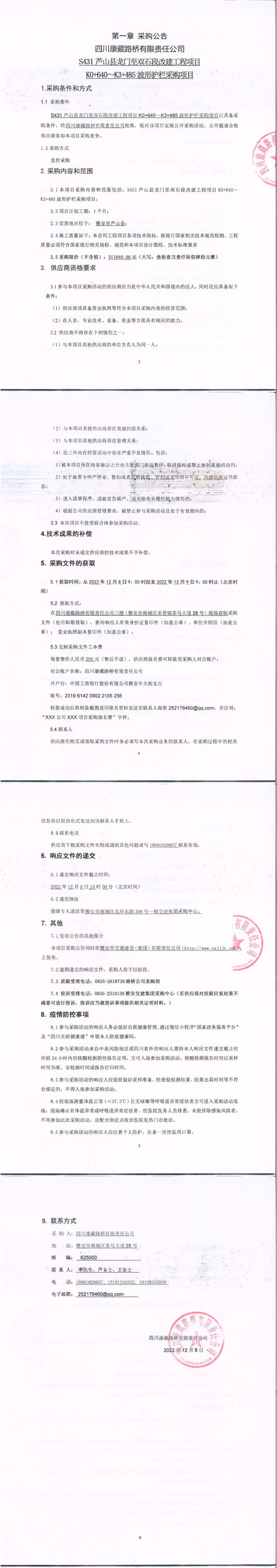 四川康藏路橋有限責(zé)任公司S431蘆山縣龍門鎮(zhèn)至雙石段改建工程項目K0+640-K3+485波形護(hù)欄采購項目采購公告