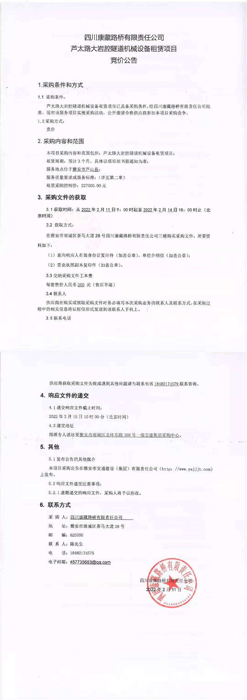 四川康藏路橋有限責任公司蘆太路大巖腔隧道機械設備租賃項目競價公告