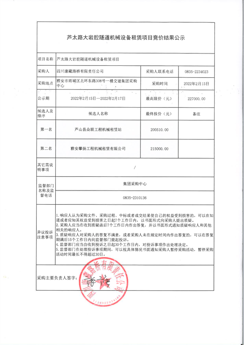 四川康藏路橋有限責(zé)任公司蘆太路大巖腔隧道機(jī)械設(shè)備租賃項(xiàng)目競價結(jié)果公示