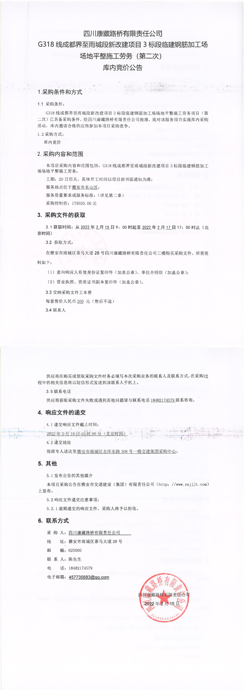 四川康藏路橋有限責任公司G318線成都界至雨城段新改建項目3標段臨建鋼筋加工場場地平整施工勞務(第二次)庫內(nèi)競價公告