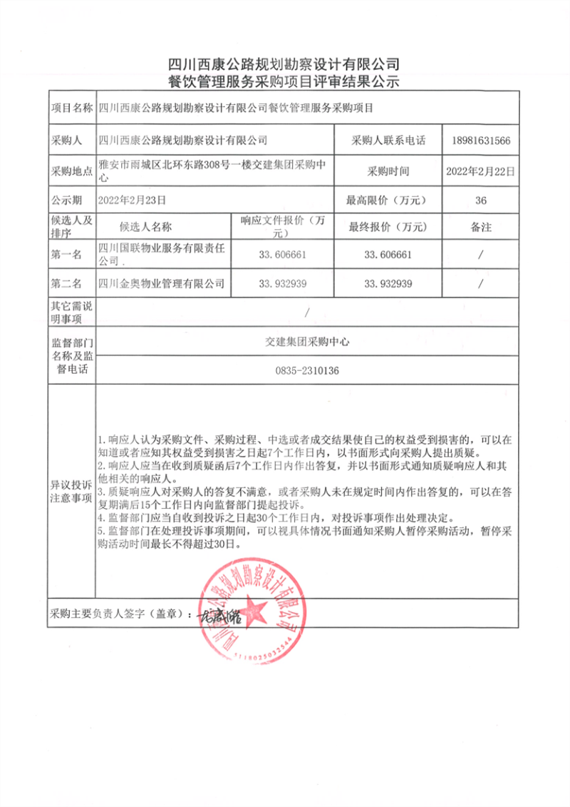 四川西康公路規(guī)劃勘察設計有限公司餐飲管理服務采購項目評審結果公示