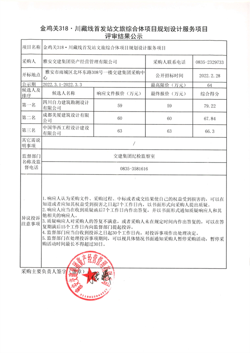 雅安交建集團(tuán)資產(chǎn)經(jīng)營(yíng)管理有限公司金雞關(guān)318.川藏線首發(fā)站文旅綜合體項(xiàng)目規(guī)劃設(shè)計(jì)服務(wù)項(xiàng)目評(píng)審結(jié)果公示