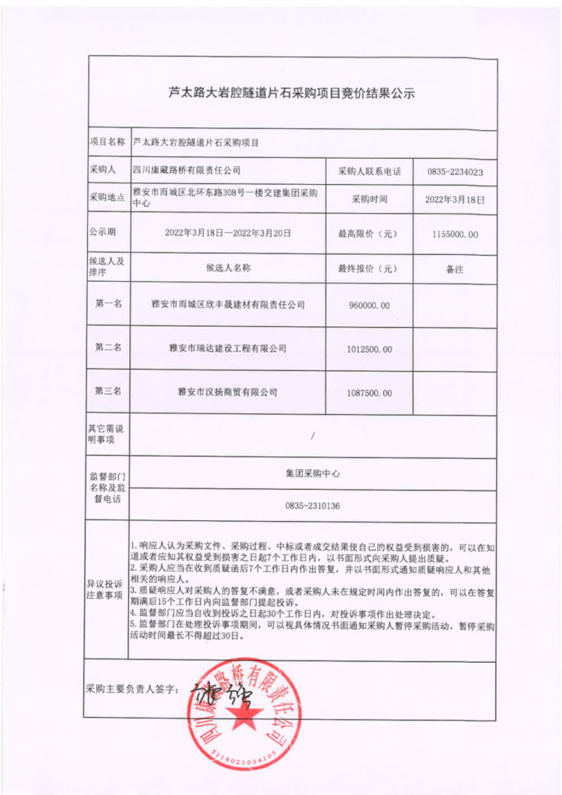 四川康藏路橋有限責(zé)任公司蘆太路大巖腔隧道片石采購項目競價結(jié)果公示