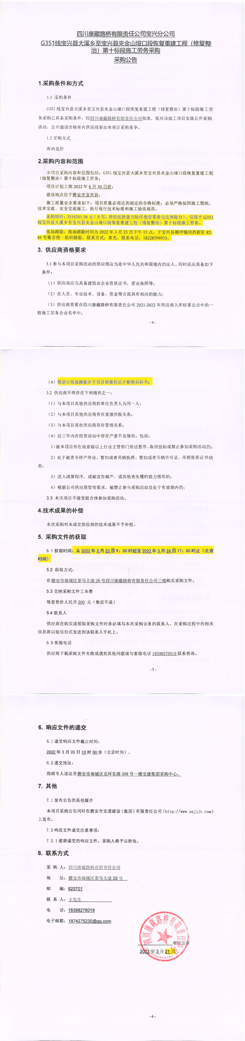 四川康藏路橋有限責(zé)任公司寶興分公司G351線寶興縣大溪鄉(xiāng)至寶興縣夾金山埡口段恢復(fù)重建工程(修復(fù)整治)第十標段施工勞務(wù)采購采購公告