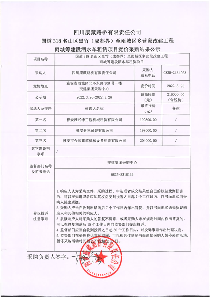 四川康藏路橋有限責(zé)任公司國道318名山區(qū)黑竹(成都界)至雨城區(qū)多營段改建工程雨城籌建段灑水車租賃項目競價采購結(jié)果公示