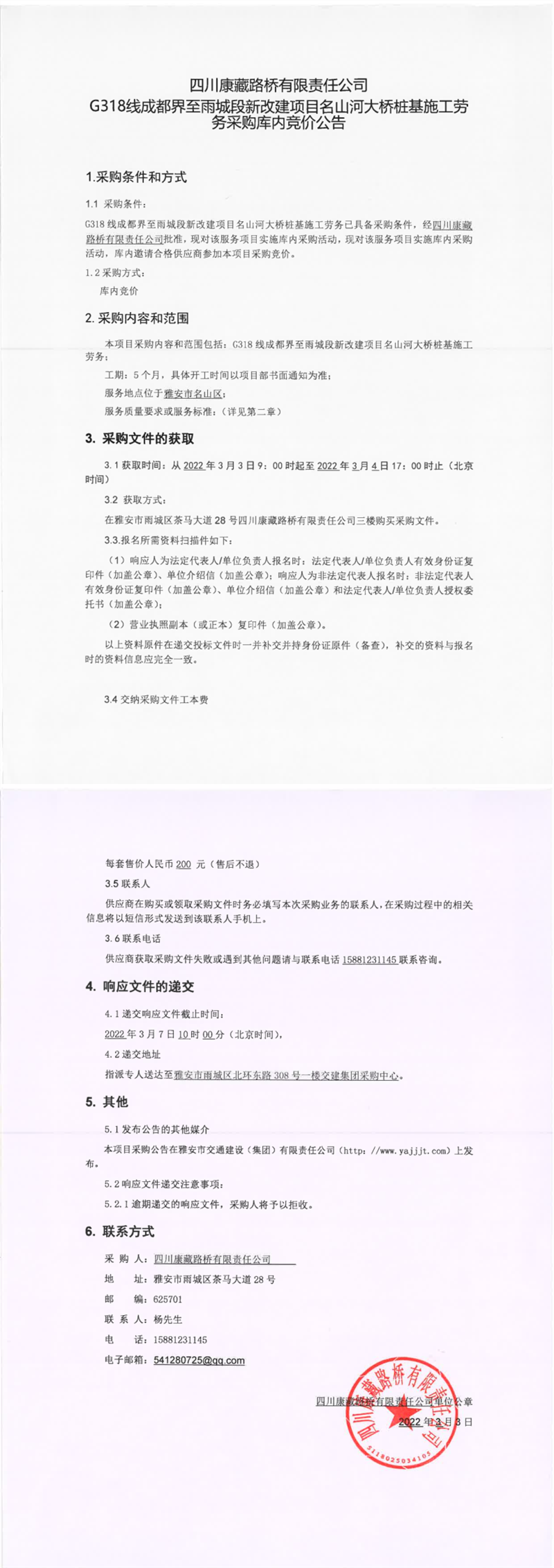 四川康藏路橋有限責(zé)任公司G318線成都界至雨城段新改建項(xiàng)目名山河大橋樁基施工勞務(wù)采購(gòu)庫(kù)內(nèi)競(jìng)價(jià)公告