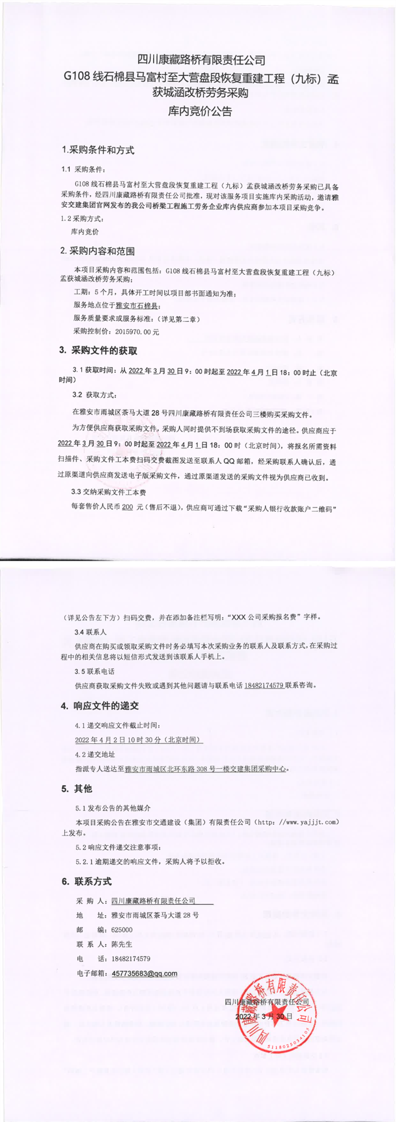 四川康藏路橋有限責(zé)任公司G108線石棉縣馬富村至大營(yíng)盤段恢復(fù)重建工程(九標(biāo))孟獲城涵改橋勞務(wù)采購(gòu)庫(kù)內(nèi)競(jìng)價(jià)公告