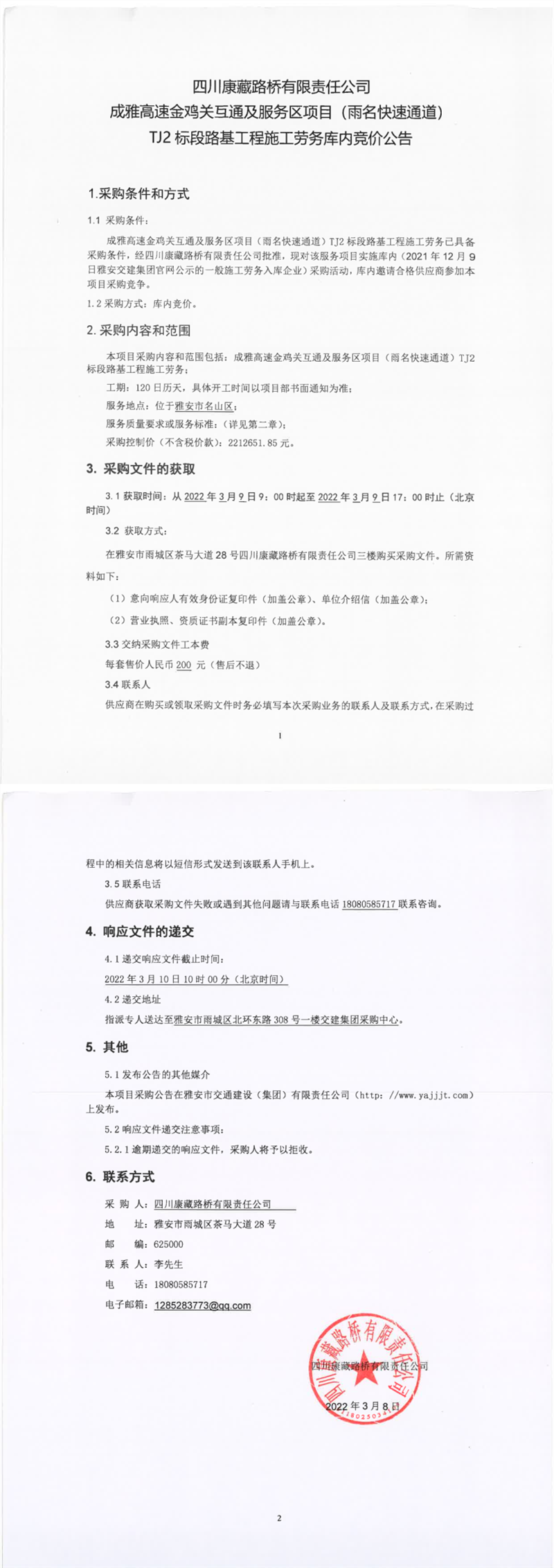 四川康藏路橋有限責(zé)任公司成雅高速金雞關(guān)互通及服務(wù)區(qū)項(xiàng)目(雨名快速通道)TJ2標(biāo)段路基工程施工勞務(wù)庫內(nèi)競價(jià)公告