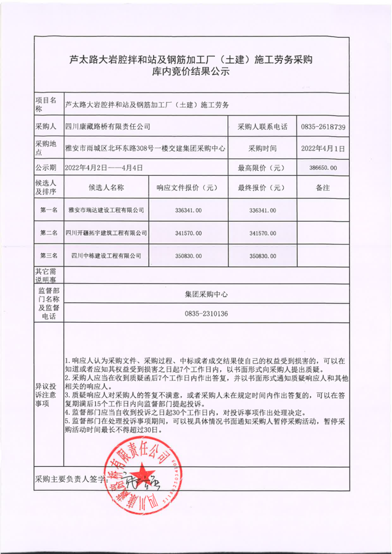 四川康藏路橋有限責(zé)任公司蘆太路大巖腔拌和站及鋼筋加工廠(土建)施工勞務(wù)采購庫內(nèi)競價結(jié)果公示