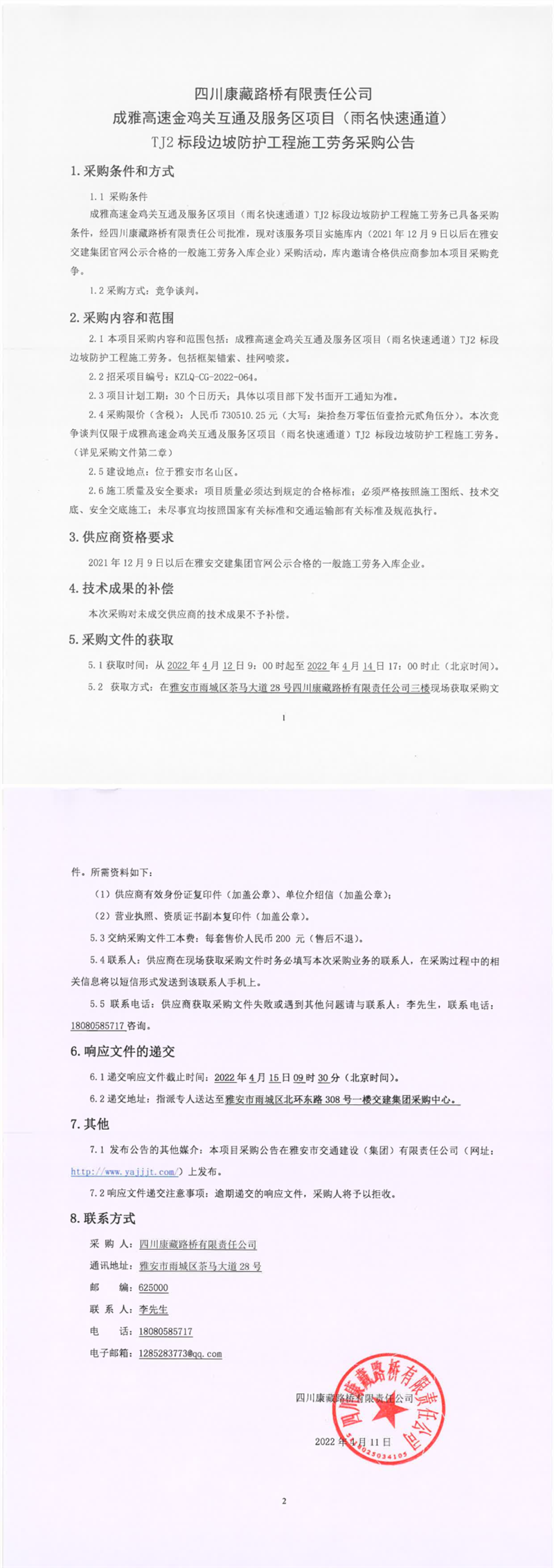 四川康藏路橋有限責(zé)任公司成雅高速金雞關(guān)互通及服務(wù)區(qū)項目(雨名快速通道)TJ2標(biāo)段邊坡防護工程施工勞務(wù)采購公告