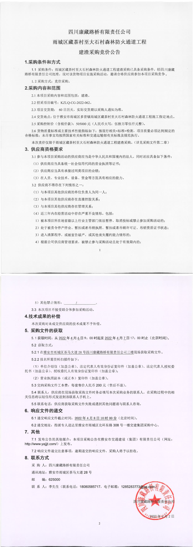 四川康藏路橋有限責(zé)任公司雨城區(qū)藏茶村至大石村森林防火通道工程建渣采購競價公告