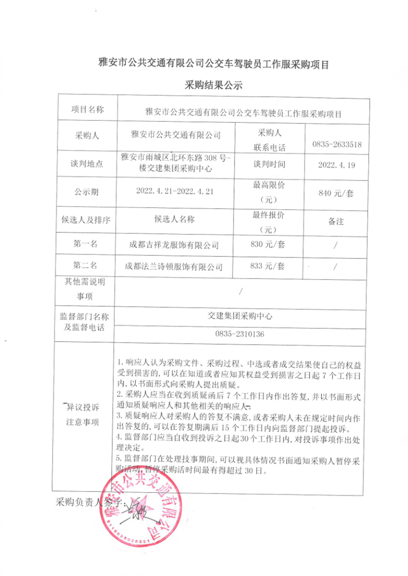 雅安市公共交通有限公司公交車駕駛員工作服采購(gòu)項(xiàng)目采購(gòu)結(jié)果公示