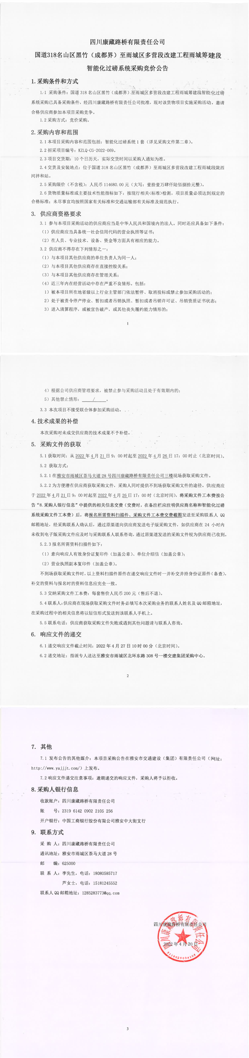 四川康藏路橋有限責(zé)任公司國(guó)道318名山區(qū)黑竹(成都界)至雨城區(qū)多營(yíng)段改建工程雨城籌建段智能化過(guò)磅系統(tǒng)采購(gòu)競(jìng)價(jià)公告