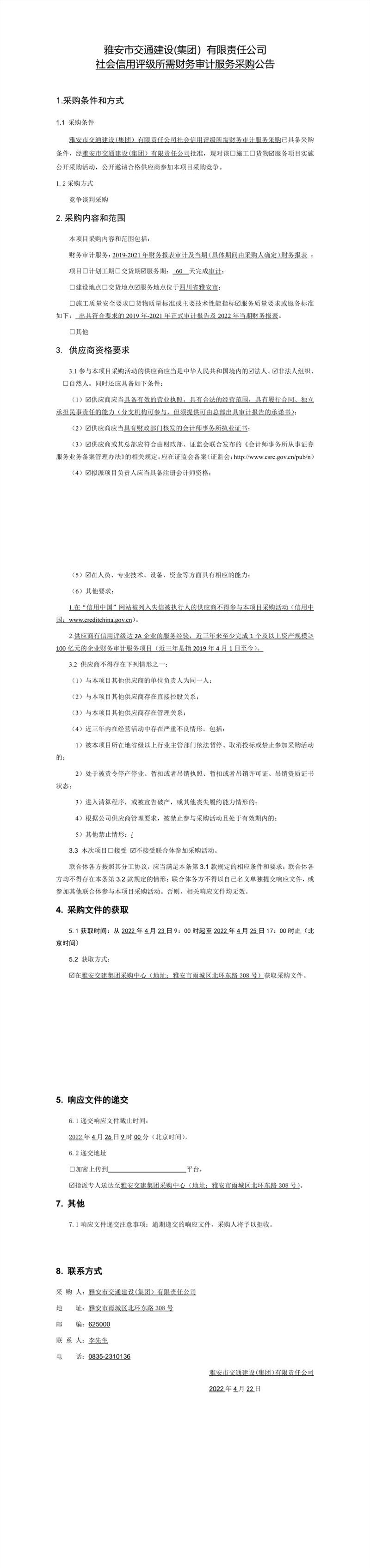 雅安市交通建設(shè)(集團)有限責任公司社會信用評級所需財務審計服務采購公告