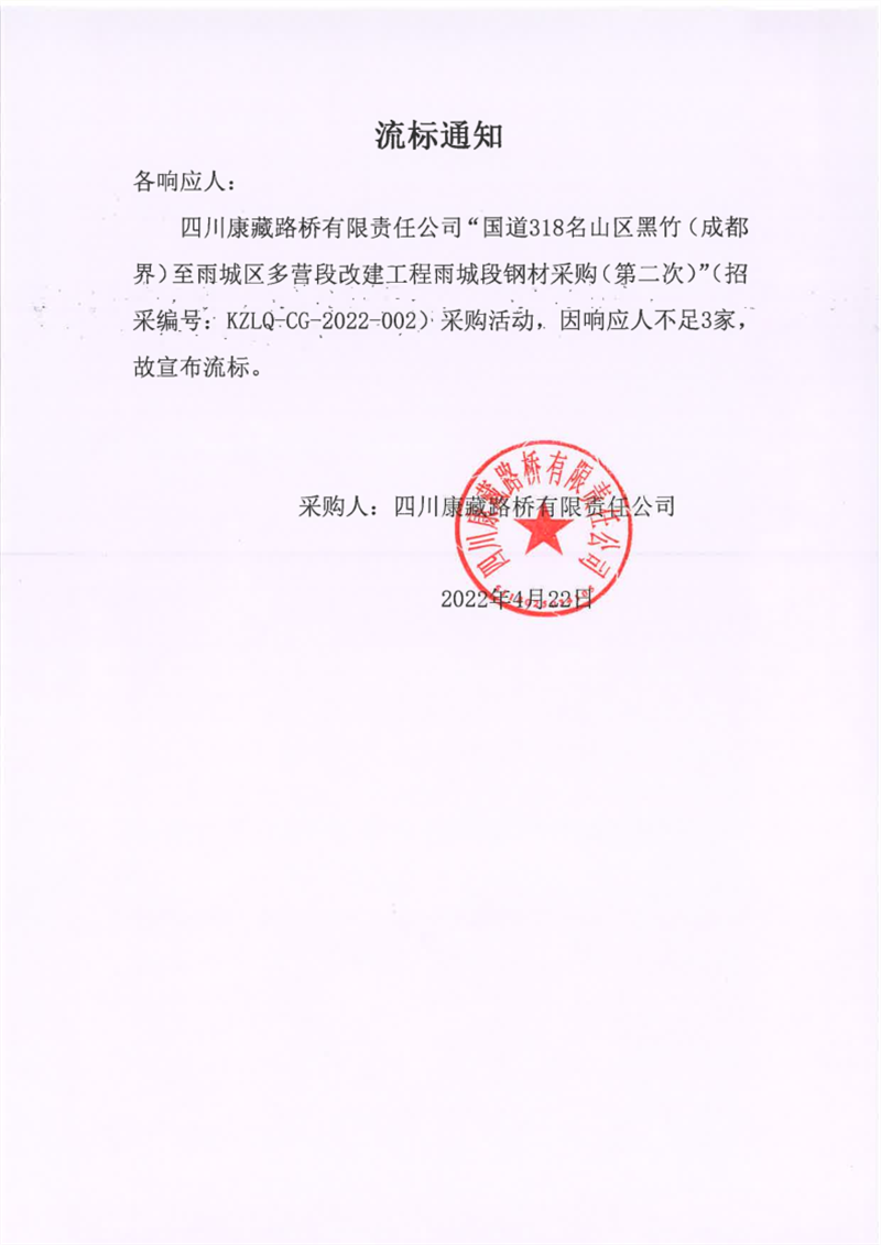 四川康藏路橋有限責(zé)任公司國道318名山區(qū)黑竹(成都界)至雨城區(qū)多營段改建工程雨城段鋼材采購(第二次)流標(biāo)通知
