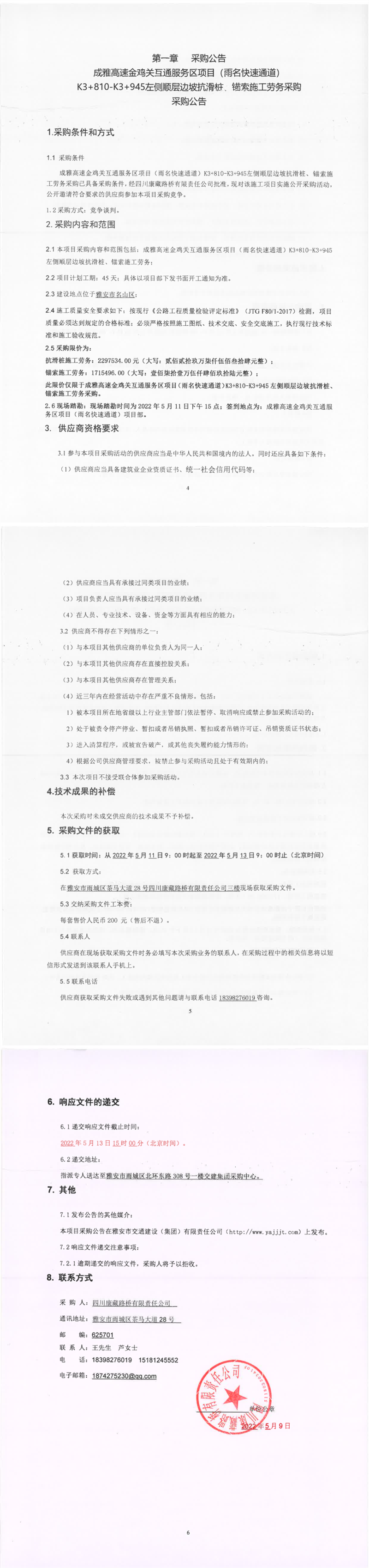 四川康藏路橋有限責(zé)任公司成雅高速金雞關(guān)互通服務(wù)區(qū)項目(雨名快速通道)K3+810-K3+945左側(cè)順層邊坡抗滑樁、錨索施工勞務(wù)采購采購公告